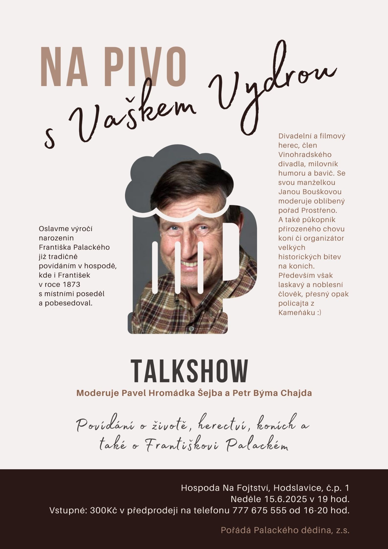 Pro připomenutí této události pořádáme talkshow Na pivo s ... a zveme si do komorního prostředí hospodského sálu vzácného hosta, se kterým pobesedujeme o životě, také trochu o Františkovi Palackém a tentokrát i o koních a herectví.. Protože naše pozvání tentokrát přijal herec a milovník humoru Václav Vydra.